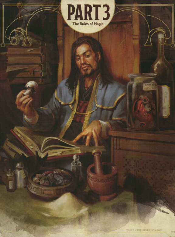 Part 3 is all about magic. It covers the nature of magic in the worlds of D&D, the rules for spellcasting, and the huge variety of spells available to magic-using characters (and monsters) in the game.